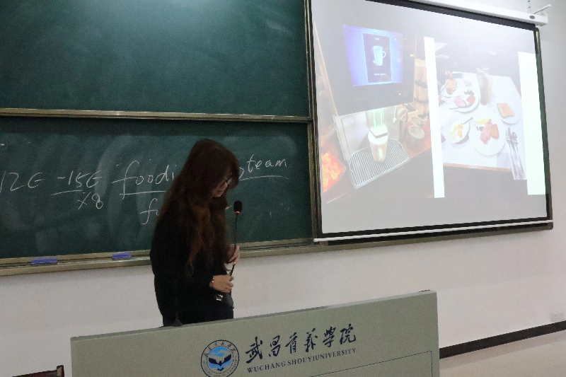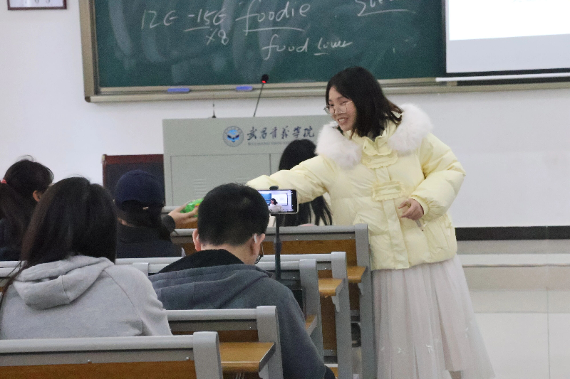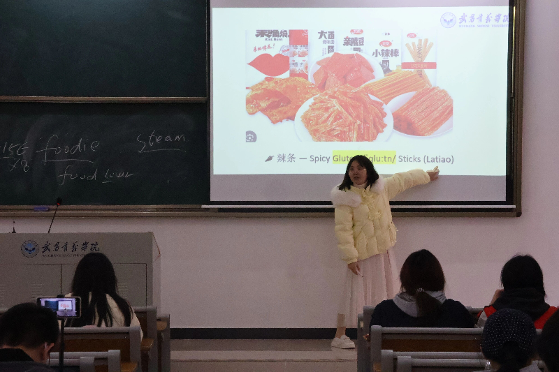 主讲人饶林芝老师毕业于比利时鲁汶大学,她从自身留学经历出发,将语言教学与美食体验巧妙融合。随后,饶林芝通过趣味互动让同学们“吃中学、学中乐”。她精心挑选热干面、螺蛳粉、辣条等美食当作例子,逐一讲解它们的英语读法:从螺蛳粉独特的“snail noodles”发音,到辣条“spicy strips”的趣味直译,再到汉堡、华夫饼等西式小吃的标准表达,用清晰发音和生动举例让单词变得鲜活。同时,她还将各类零食带入课堂,作为发言同学们的奖励,以此来调动同学们的积极性。